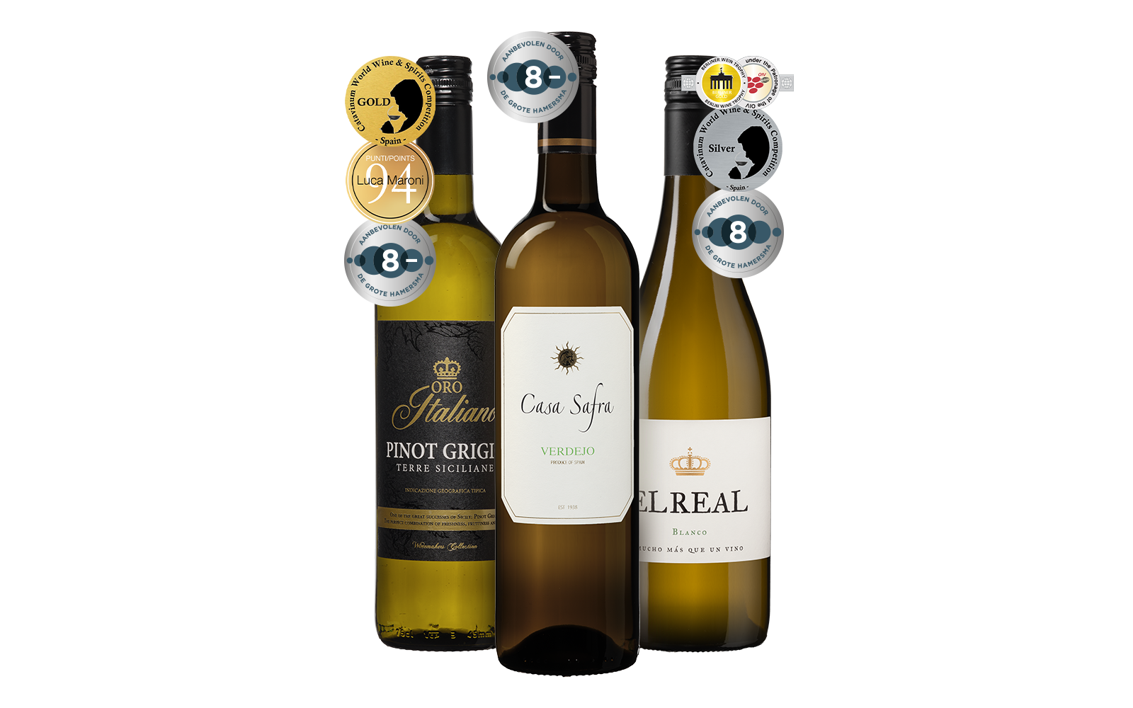 Drie keer wit genieten met onze Huisfavorieten! In dit Probeerpakket ontdek je de frisse charme van de Oro Italiano Pinot Grigio, een elegante Italiaan vol sappige peer en een verkwikkende afdronk. Uit Spanje komt de zonnige Casa Safra Verdejo, levendig en aromatisch met frisse citrus en knapperig groen fruit. En als derde verrassing proef je de El Real Blanco: soepel, toegankelijk en heerlijk fruitig. Samen vormen deze drie publiekslievelingen een veelzijdig wit pakket dat altijd in de smaak valt. Perfect om nieuwe favorieten te ontdekken of gewoon om je wijnrek in één keer goed aan te vullen. Proeven maar!