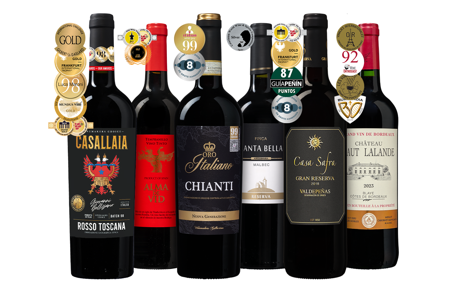 Zes keer raak. En niet zomaar raak – dit zijn stuk voor stuk roodwijnen die overladen zijn met medailles. In het Medailleknallers Rood pakket proef je bewezen kwaliteit uit verschillende topregio’s. Met als absolute uitblinker Casallaia (maar liefst 5 medailles!) en publieksfavoriet Oro Italiano Chianti (99 punten IWG en 8 DGH). Ook Casa Safra Gran Reserva schittert met 4 medailles, net als Ch Haut Lalande. De krachtige Finca Santa Bella Malbec won een zilveren medaille en Alma de Vid viel twee keer in de prijzen. Dit pakket is perfect als je zeker wilt zijn van kwaliteit in je glas. Ontdek zelf waarom deze wijnen door internationale jury’s zijn bekroond – en maak van ieder moment een medaillewaardig genietmoment.