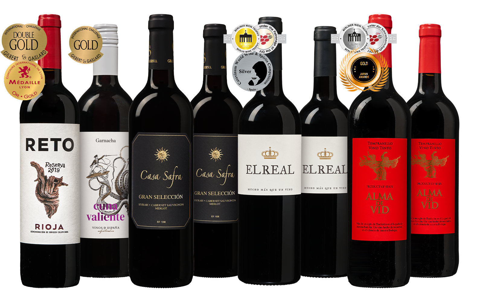 Ontdek de kracht en warmte van Spaans rood met dit veelzijdige wijnpakket. Van de elegante Reto Rioja en sappige Cuna Valiente Garnacha tot de krachtige Casa Safra Gran Selección, de populaire El Real Tinto en de soepele Alma de Vid Tempranillo. Een selectie vol rijp fruit, kruidigheid en Spaanse zon. Perfect om verschillende stijlen uit Spanje te ontdekken – van klassiek Rioja tot zwoel en modern rood.